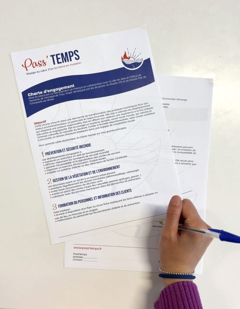 Pour y répondre, nous avons conçu Pass’Temps, un dispositif expérientiel et participatif invitant les visiteurs à découvrir la ville de Sète à travers un parcours de sensibilisation alliant patrimoine, culture et prévention. Les touristes reçoivent un kit de découverte comprenant une carte, un passeport à tamponner et une fiche explicative, leur permettant de suivre un itinéraire modulable selon la saison. Chaque lieu partenaire propose une activité en lien avec la mémoire et la symbolique du feu ou avec la prévention environnementale. À l’issue du parcours, les visiteurs reçoivent une carte postale souvenir et un timbre exclusif, symboles de leur engagement envers un tourisme plus conscient et résilient.