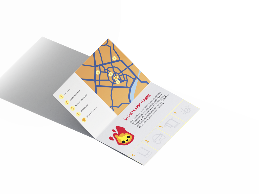Mise en place d’une sensibilisation douce et constante, réalisée sous la forme d’un jeu de piste. Promue par l’office de tourisme, celle-ci permettra aux touristes et au locaux de découvrir les bons comportements à suivre en cas d’incendie. Une fois le parcours terminé, les participants se verront offrir un goodies à l’effigie des personnages de jeu. Goodies qui ont été choisies, afin de permettre la sensibilisation des joueurs dans leur vie quotidienne.