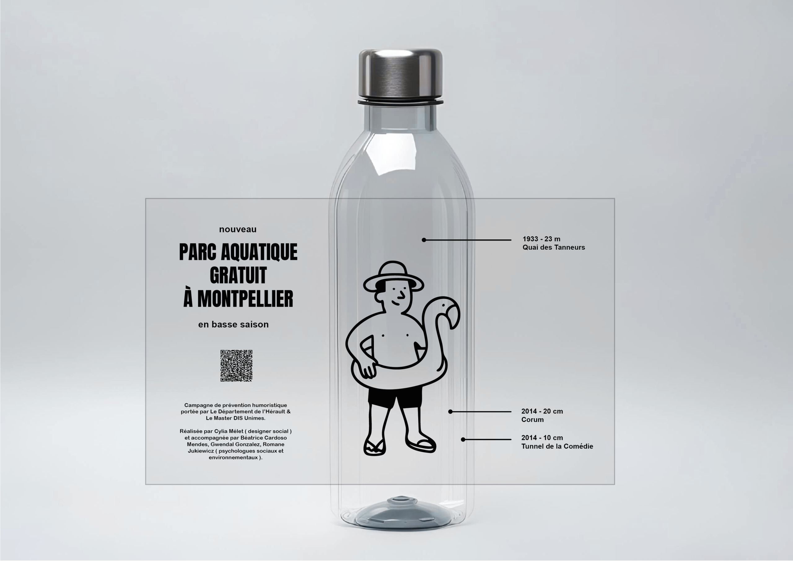 Et si Montpellier sous la pluie devenait un parc aquatique ? Ce projet, en rupture avec les codes habituels de prévention, choisit l’humour comme levier pour sensibiliser aux risques inondation. Il met en scène l’illusion d’une fausse offre commerciale de parc d’attraction, et invite les touristes à faire l’inverse des bons gestes à adopter en cas d’inondation. En scénarisant des comportements loufoques, ce projet de design critique tente de créer les sourires pour favoriser la réflexivité.